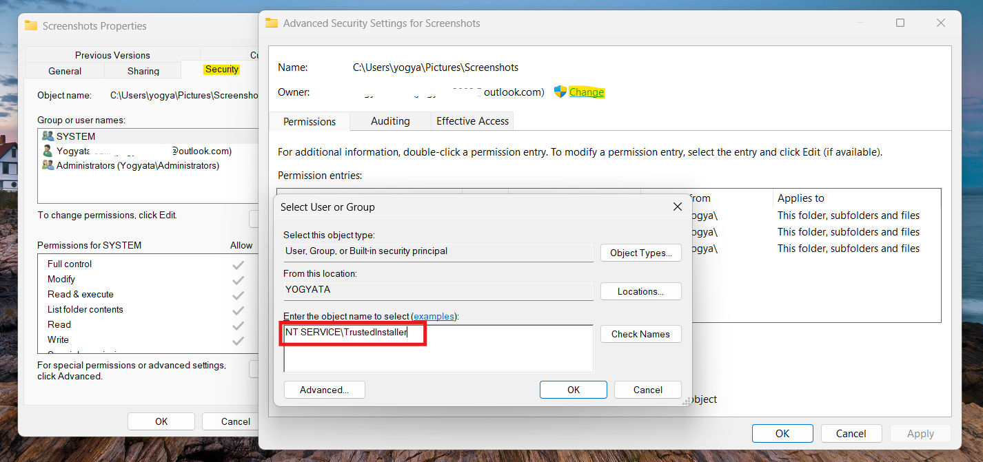 2. W obszarze Właściciel kliknij Zmień i zatwierdźNT SERVICETrustedInstaller.