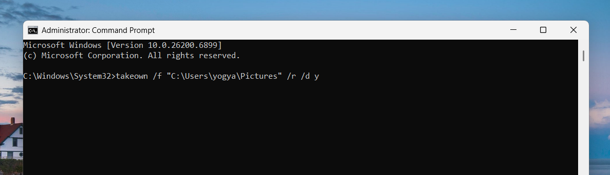 2. Użyjtakeown /f "C:PathToFile_or_Folder" /r /d ydomagać się własności celu.