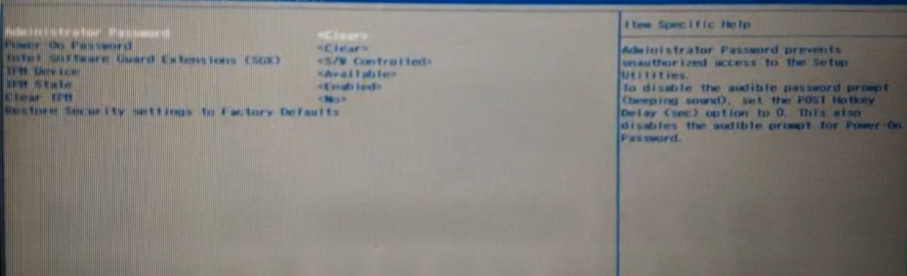 - W systemie BIOS kliknij przyciskBezpieczeństwoZakładka i kliknijWyczyść moduł TPM.