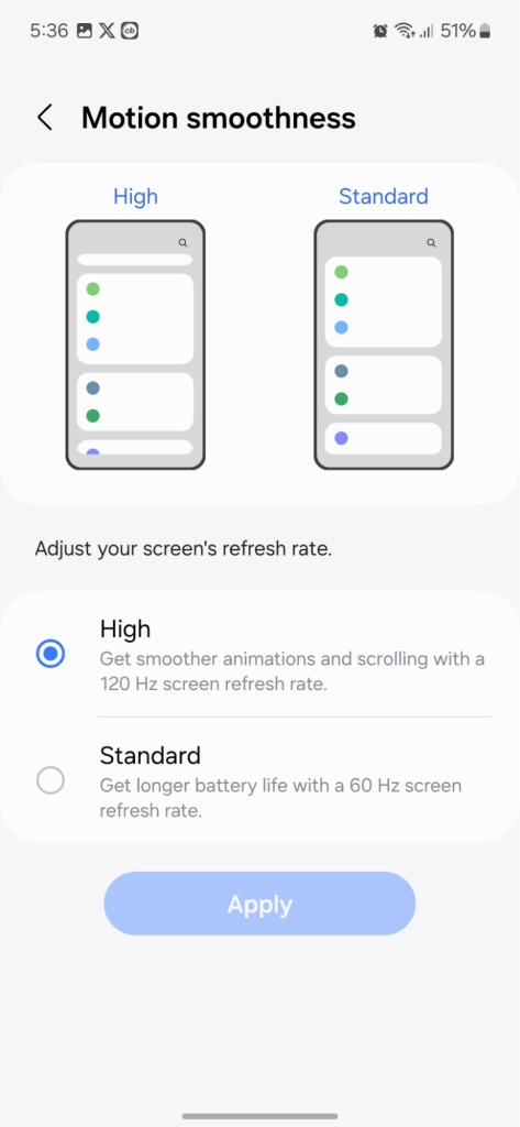 Krok 3:Następnie przewiń nieco w dół i wybierz jedno z nichPłynność ruchu lub częstotliwość odświeżania ekranu.