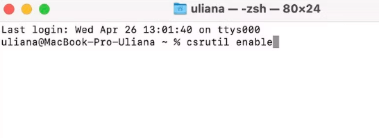 Krok 6:Po ponownym uruchomieniu komputera Mac funkcja SIP powinna zostać wyłączona. Możesz sprawdzić jego status otwierając Terminal i wpisując polecenie: csrutil enable