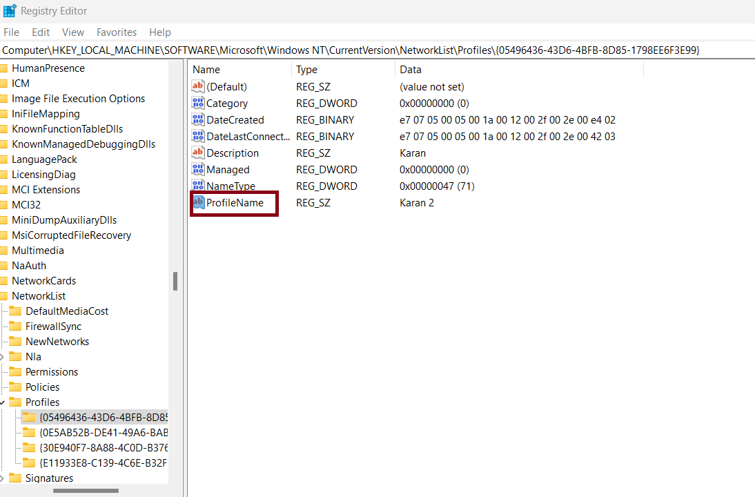 Computer > HKEY_LOCAL_MACHINE > SOFTWARE > Microsoft > Windows NT > CurrentVersion > NetworkList > Profiles.