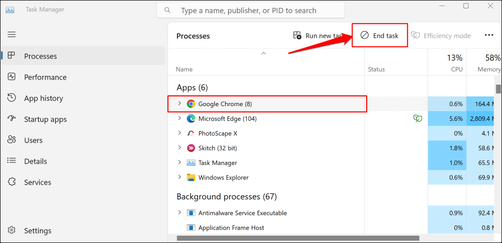 W systemie Windows otwórz Menedżera zadań (naciśnijklawisz kontrolny+Zmiana+Wyjście), wybierz Google Chrome i wybierzZakończ zadanie.