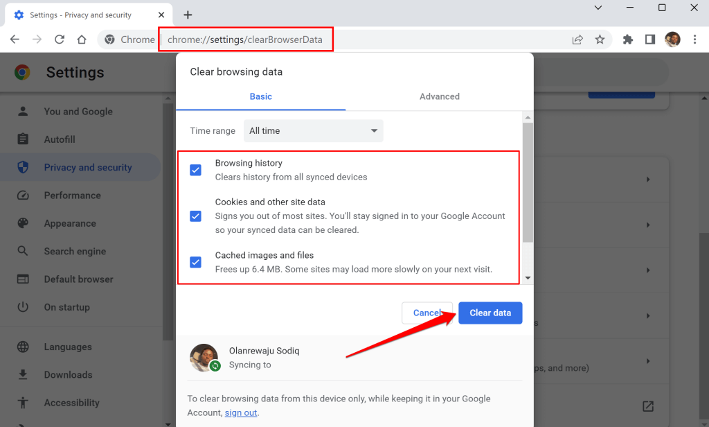 - Pastachrome://settings/clearBrowserDataw pasku adresu przeglądarki Chrome i naciśnijWchodzićLubPowrótna klawiaturze.