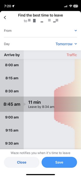 W ten sposób możesz również uzyskać informacje generowane przez użytkowników na temat ruchu, cen gazu i innych danych w Waze od innych użytkowników w społeczności. Kolejna kluczowa funkcja Waze obejmujeMożliwość zaplanowania jazdy do określonej lokalizacji z wyprzedzeniem. Możesz spojrzeć na przeciętne dane dotyczące ruchu trasy planowanej jazdy o różnych porach dnia.