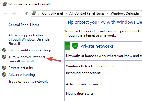 1. WybierzWyłącz Zaporę systemu Windows Defender (niezalecane)dla obuprywatnyIpublicznyopcje ustawień sieciowych.