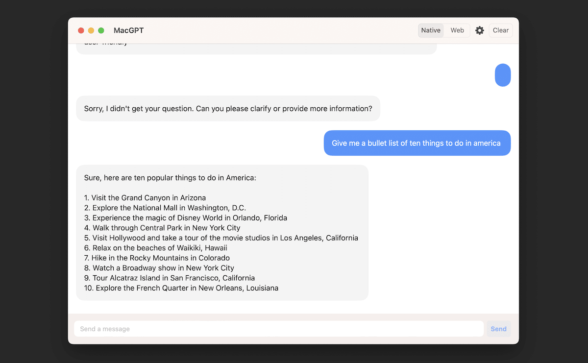 Aplikacja MacGPT odtwarza wszystkie opcje witryny ChatGPT, dzięki czemu użytkownicy komputerów Mac mogą rozmawiać z chatbotem. Jest kompatybilny z systemami macOS Monterey i Ventura, a użytkownicy mogą także ustawić jego okno tak, aby zawsze pozostawało na wierzchu, utworzyć skrót klawiaturowy, aby szybko go uruchomić, a także dodać jego ikonę do paska menu komputera Mac, aby uzyskać dostęp do chatbota AI.