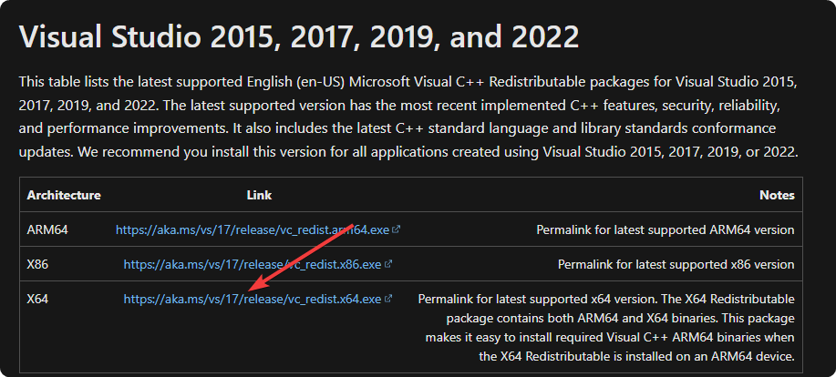 - Idź doStrona redystrybucyjna Microsoft Visual C++.