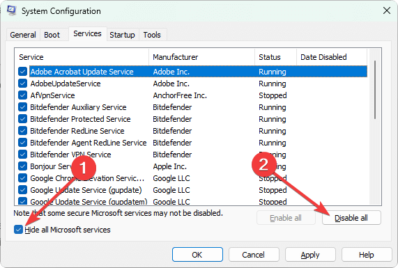 - KleszczUkryj wszystkie usługi Microsofta następnie kliknijWyłącz wszystko.