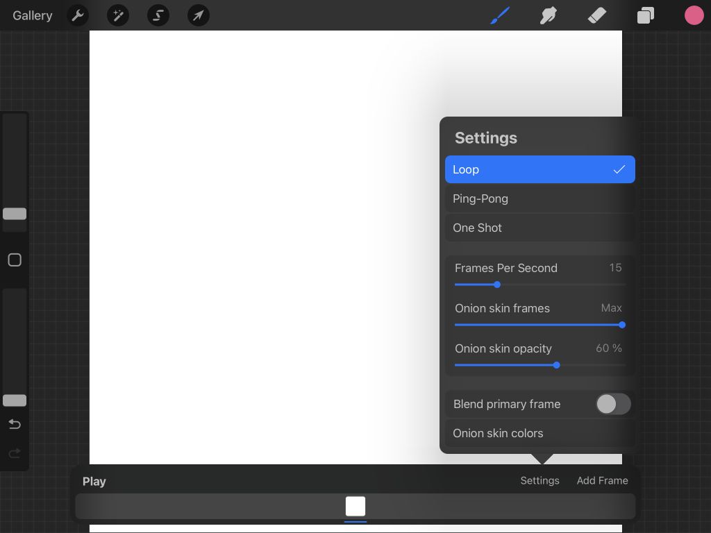 Ustawienia:Przycisk Ustawienia umożliwia zmianę różnych opcji animacji i klatek, np. tego, czy animacja będzie zapętlona czy odtwarzana w jednym ujęciu, liczba klatek na sekundę i efekt cebuli.