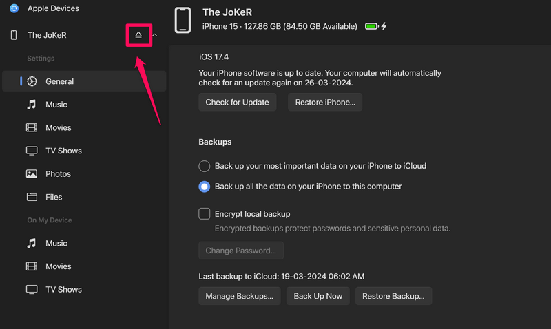 11.Po zakończeniu procesu tworzenia kopii zapasowej możesz to zrobićwysuń iPhone'aw aplikacji Apple Devices iodłącz go od komputeralub laptopa.