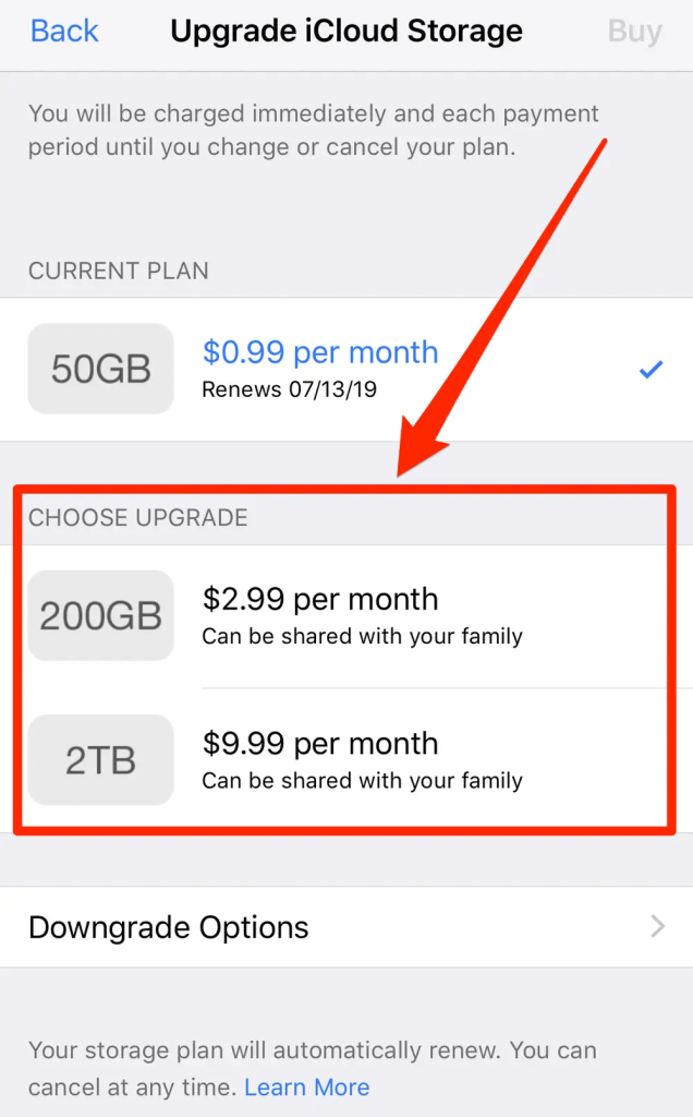 Możesz wybierać spośród 50 GB za 0,99 USD miesięcznie, 200 GB za 2,99 USD miesięcznie lub 2 TB za 9,99 USD miesięcznie. (Uwaga: cena może się różnić w zależności od regionu, możesz odwiedzićWsparcie Appleaby uzyskać więcej informacji)