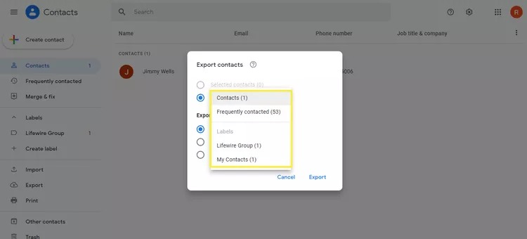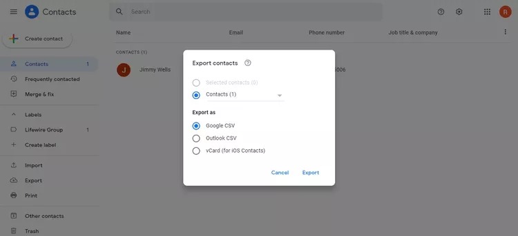 4.WybierzPlik CSV Googleprzycisk opcji podEksportuj jakosekcję, a następnie naciśnij przyciskEksportprzycisk.