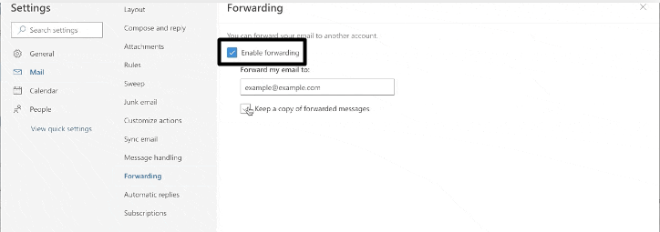 4.ZaznaczWłącz przekazywaniepole wyboru i wpisz swój nowy adres e-mail w poluPrzekaż mój e-mail na adres:pole tekstowe.