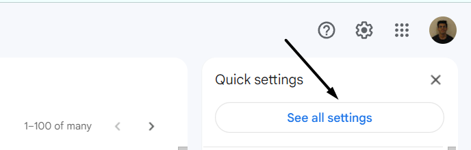 2.WybierzZobacz wszystkie ustawieniaopcje z wyskakującego paska bocznego, aby uzyskać dostęp do ustawień konta Gmail.