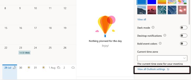 2.Kliknij naWyświetl wszystkie ustawienia programu Outlooklink wUstawieniapanelu, aby uzyskać dostęp do ustawień.