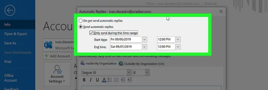 3.WybierzWysyłaj automatyczne odpowiedziprzycisk radiowy i odznacz opcjęWysyłaj tylko w tym przedziale czasowymskrzynka.