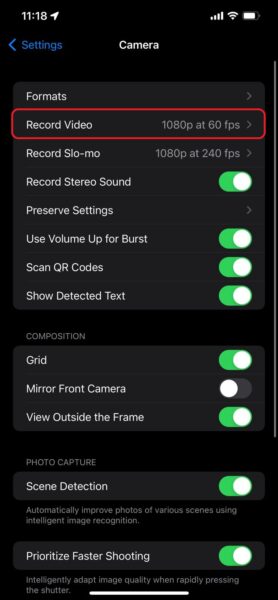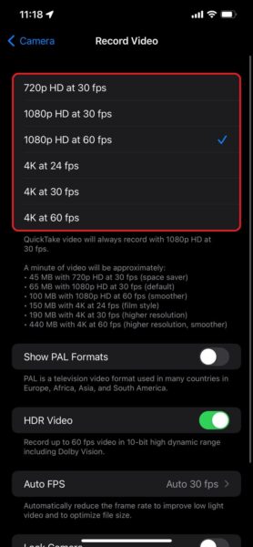 - Teraz możesz ręcznie wybrać liczbę klatek na sekundę i rozdzielczość, w jakiej chcesz nagrywać filmy.