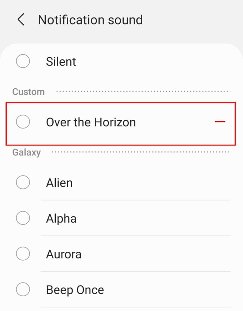 - Teraz powinno być możliwe przewijanie różnych dźwięków dostępnych w urządzeniu Samsung. Następnie po prostu dotknij jednego, aby go aktywować.