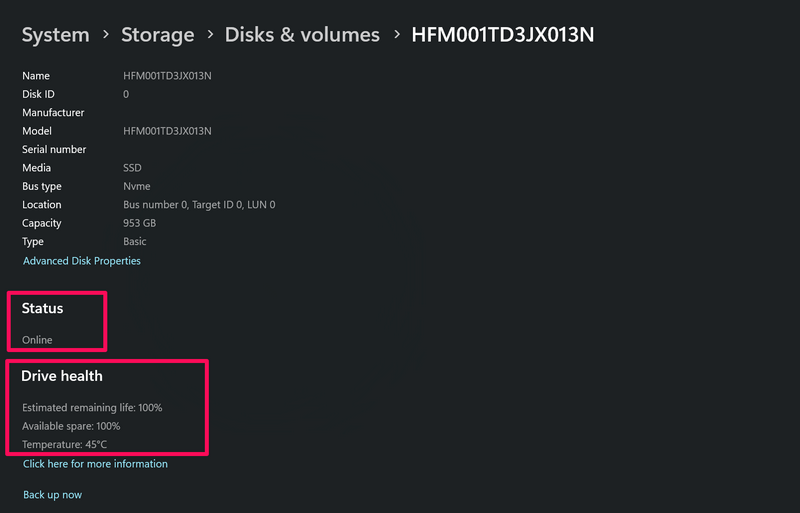 6.Możesz dalej kliknąćWłaściwościprzycisk, aby otworzyć swoje nieruchomości i sprawdzić więcej informacji na temat jego ogólnego zdrowia, szacowanego żywotności, dostępnego procentowego procentu i temperatury w ramachStatusIProwadzić zdrowiesekcje.