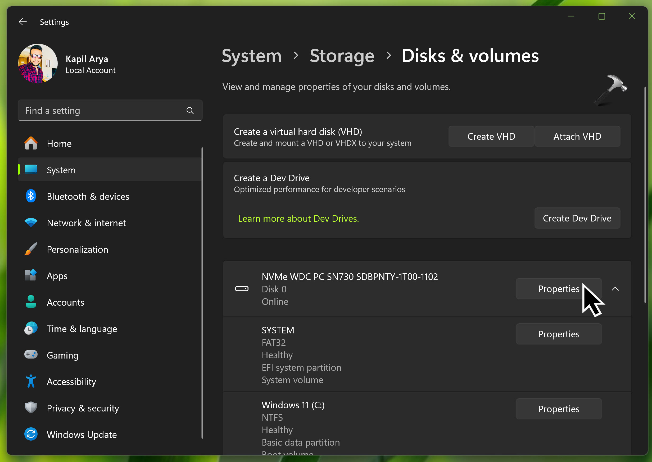 2. W obszarze Dyski i woluminy zlokalizuj dysk i kliknij Właściwości.