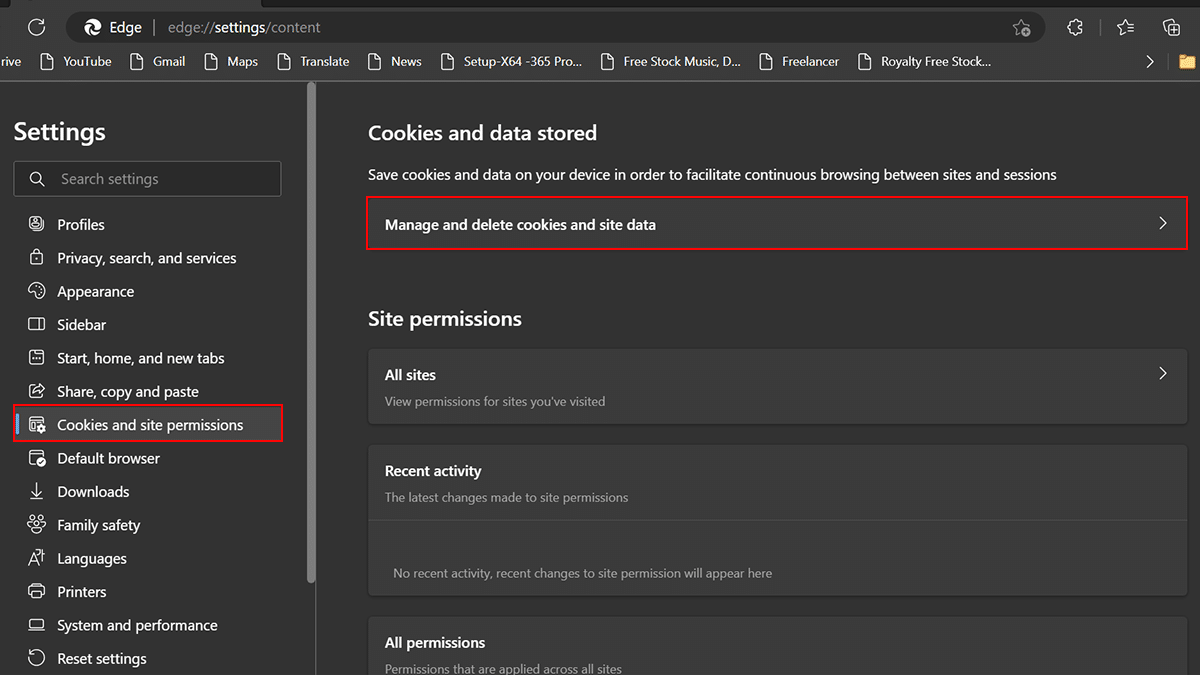 - KliknijPliki cookie i uprawnienia witryny> kliknijZarządzaj i usuwaj pliki cookie oraz dane witrynopcja.