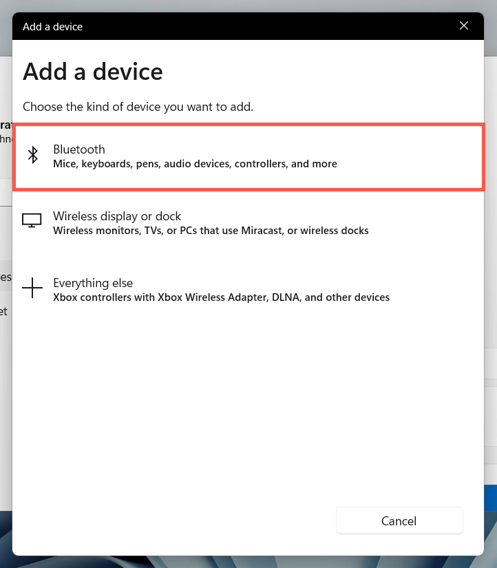 - WybieraćBluetooth i urządzeniai wybierzDodaj urządzenie.