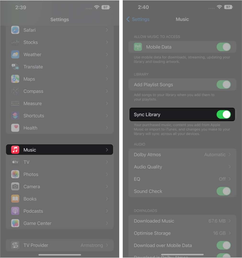 Na iPhonie:Ustawienia ➝ Muzyka ➝ Synchronizuj bibliotekę.