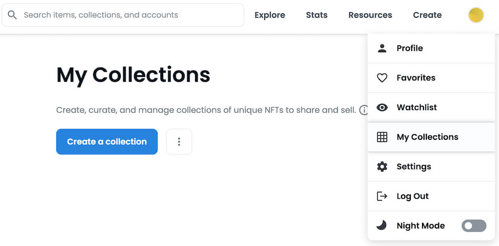 - W OpenSea najpierw musisz utworzyć kolekcję NFT. Aby to zrobić, wybierzMoje kolekcjez menu witryny i wybierzUtwórz kolekcję.
