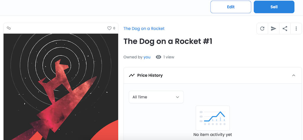 Kiedy wybijesz NFT, możesz wystawić go na OpenSea i poczekać na pierwszą sprzedaż. Aby sprzedać swój NFT, otwórz go ze swojej kolekcji i wybierz niebieskiSprzedaćprzycisk w prawym górnym rogu ekranu.