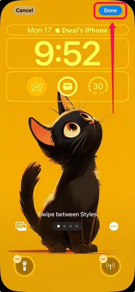 12.Po usunięciu i/lub dodaniu nowego elementu sterującego do wybranego obszaru przycisku szybkiej akcji na ekranie blokady iPhone'a stuknijPrzycisk Gotowew prawym górnym rogu, aby zapisać zmianę.