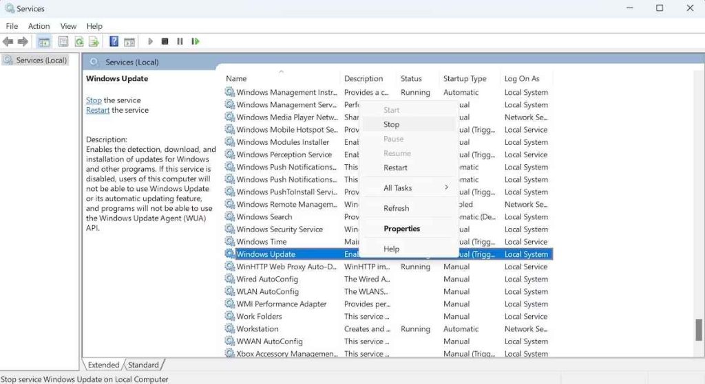 Krok 2:LokalizowaćUsługa Windows Updatew oknie Usługi kliknij je prawym przyciskiem myszy i wybierzZatrzymywać się.