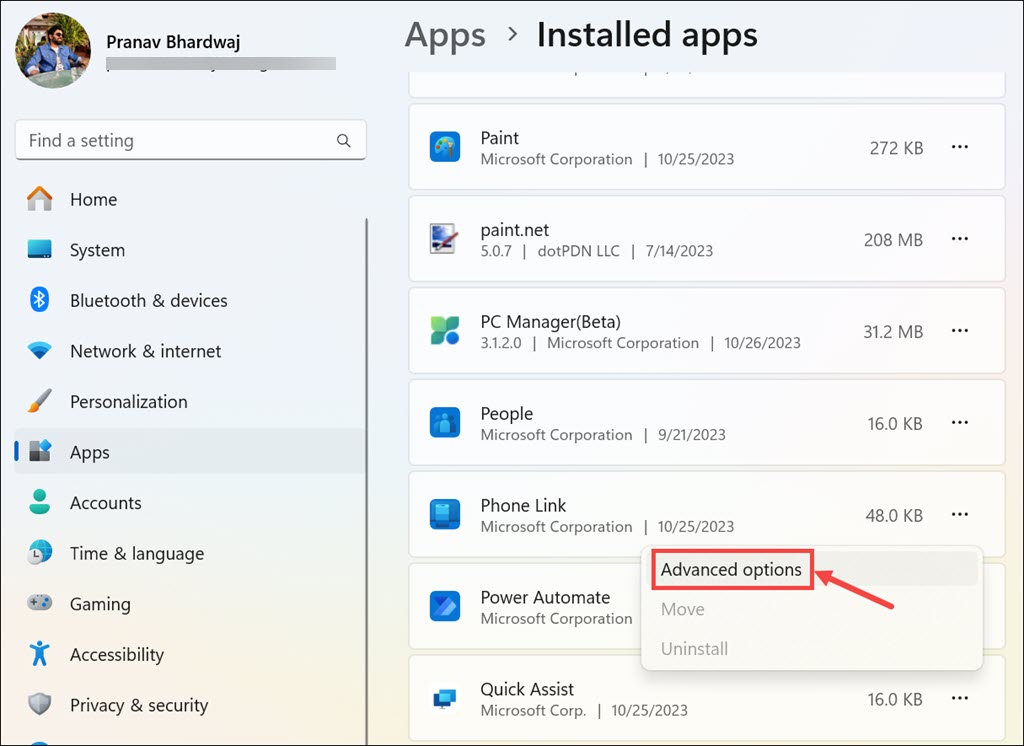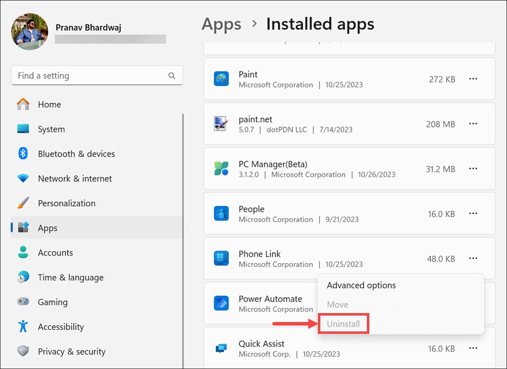 4.Kliknij ikonę trzech kropek i wybierzOdinstalujz dostępnych opcji. Ta opcja będzie dostępna tylko w przypadku aktualizacji do systemu Windows 22H3 lub nowszego.
