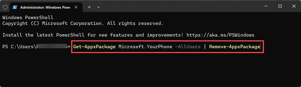 2.W oknie PowerShell wpisz następujące polecenie, aby odinstalować aplikację Phone Link:Get-AppxPackage Microsoft.YourPhone -AllUsers | Remove-AppxPackage