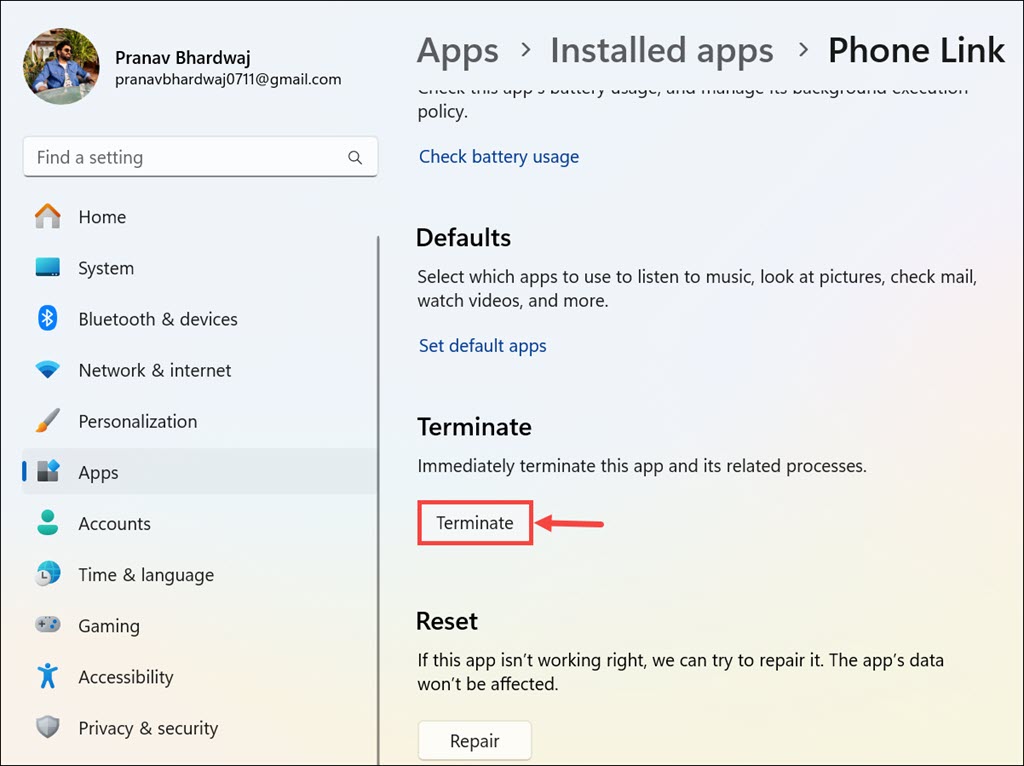 6.Następnie przewiń w dół i kliknijZakończyćaby natychmiast zamknąć wszystkie wystąpienia aplikacji Phone Link.