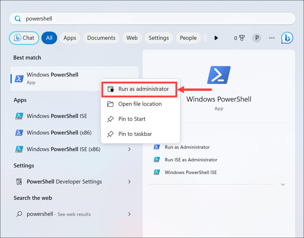 1.Wpisz „Windows PowerShell” w pasku wyszukiwania systemu Windows, kliknij prawym przyciskiem myszy jego ikonę i wybierzUruchom jako administratoraby otworzyć Windows PowerShell z podwyższonymi uprawnieniami.