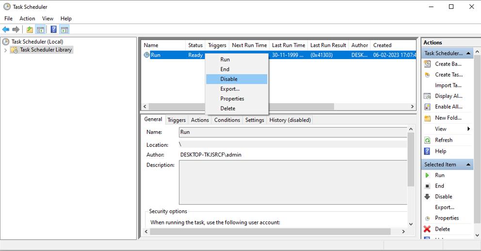 Najlepszym podejściem może być wyłączenie zadań za pomocą Harmonogramu zadań, ponieważ dostarcza on dodatkowych szczegółów na temat zadania. Możesz sprawdzić opis zadania, wyzwalacze lub historię, korzystając z menu Właściwości.