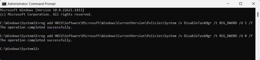 reg add HKCUSoftwareMicrosoftWindowsCurrentVersionPoliciesSystem /v DisableTaskMgr /t REG_DWORD /d 1 /f