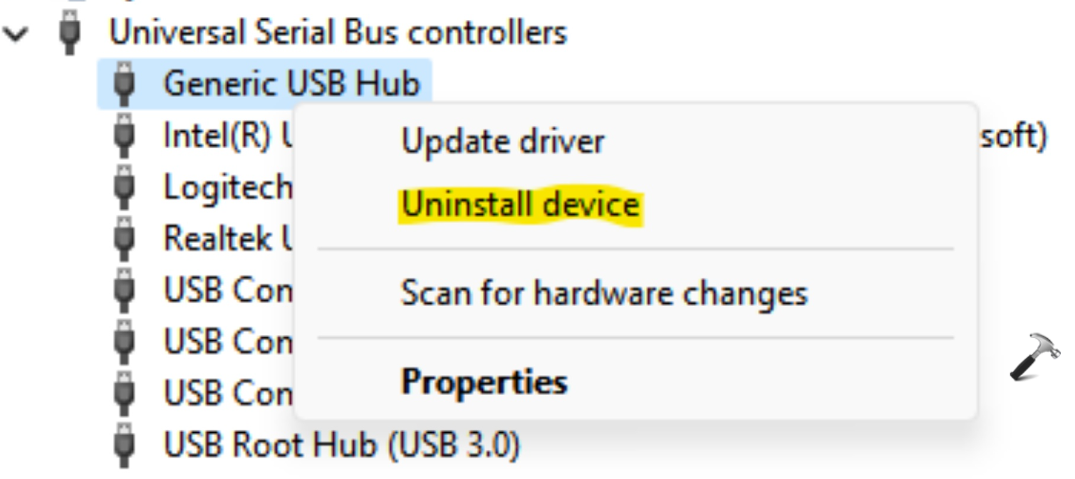 4.Aby wyłączyć porty USB, kliknij każdy port prawym przyciskiem myszy, a następnie wybierz opcjęWyłącz urządzenieWykonaj tę czynność dla każdego portu USB, aby wyłączyć wszystkie porty USB.