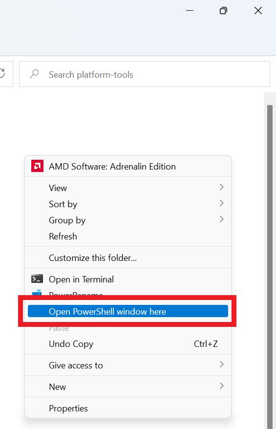 Krok 4:Pozostając w tym folderze ADB, naciśnijKlawisz ShiftIkliknij prawym przyciskiem myszyw dowolnym miejscu folderu.