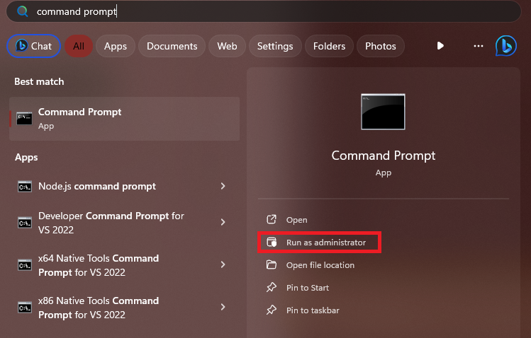 1.NaciśnijWygraćklawisz na klawiaturze, aby otworzyć plikMenu startowe.TypWiersz poleceńw pasku wyszukiwania i wybierzUruchom jako administratoropcja.