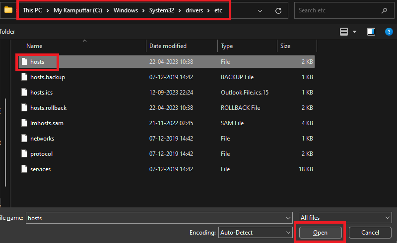 C:WindowsSystem32driversetc6.Wybierzzastępy niebieskieplik i kliknijOtwarteprzycisk.