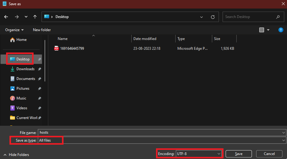 8.Na stronie zapisywania wybierz lokalizację, na przykład pulpit. Następnie zmień typ pliku naWszystkie plikii na koniec, upewnij się, że używasz tylkoANSILubUTF-8. Po wykonaniu tych wszystkich czynności kliknij przyciskRatowaćprzycisk.