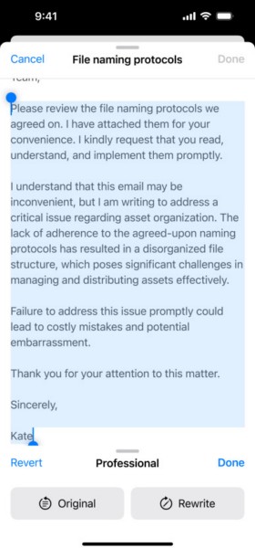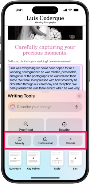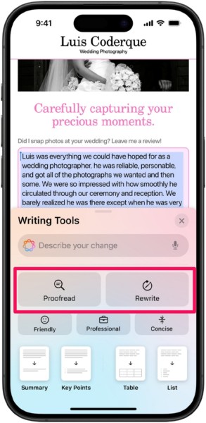 Inteligentne narzędzia do pisania to jedne z najbardziej imponujących narzędzi do pisania AI, które będą dostępne po włączeniu Apple Intelligence na iPhonie w systemie iOS 18. Należą do nich:Narzędzie do korektyi aNarzędzie do przepisywaniai kilka innych przydatnych narzędzi, które mogą pomóc w opracowywaniu treści pisanych w systemie, a także w aplikacjach innych firm.