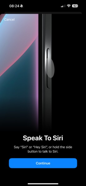 6.Na poniższym ekranie powitalnym zostanie pokazane, jak uruchomić Siri za pomocą funkcji budzenia „Siri” lub „Hej Siri” lub za pomocą przycisku bocznego. KliknijPrzycisk Kontynuuj.