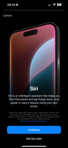 7.Ostatni ekran powitalny wyjaśnia, jak możesz teraz pisać do Siri, po prostu dwukrotnie dotykając dolnej krawędzi ekranu iPhone'a. KliknijPonownie przycisk Kontynuujaby zakończyć konfigurację.