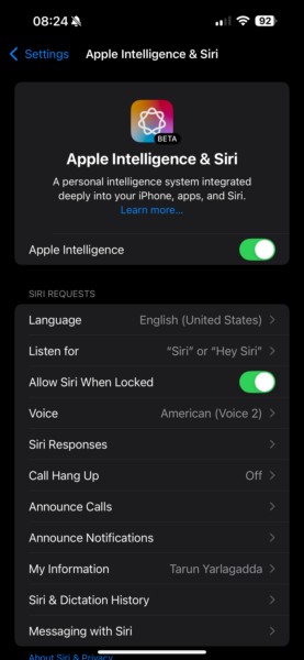 8.Powrócisz teraz do strony ustawień Apple Intelligence i Siri i zobaczysznowa opcja Apple Intelligence wraz ze zwykłym przełącznikiemaby włączyć lub wyłączyć tę funkcję na swoim urządzeniu.
