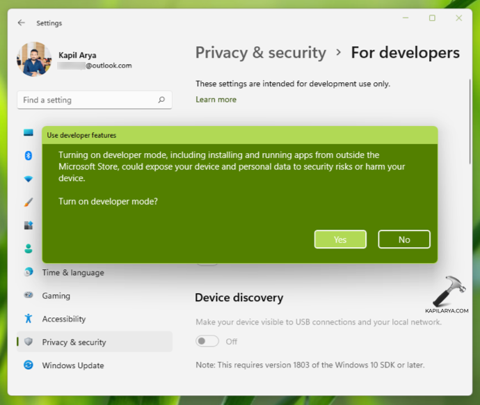 5.Zanim tryb programisty zostanie faktycznie włączony, pojawi się monit o potwierdzenie, kliknijTakw tym. Jeśli w tym monicie klikniesz Nie, tryb programisty nie zostanie włączony.
