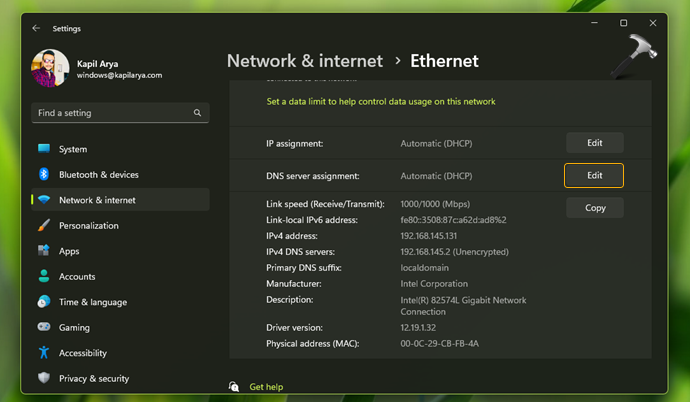 3.Na następnej stronie kliknijRedagowaćprzycisk przeciwko przypisaniu serwera DNS.