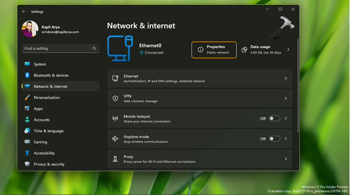 2.W aplikacji Ustawienia przejdź doSieć i Internet.KliknijWłaściwościobok Ethernet/WiFi, z którym jesteś połączony.